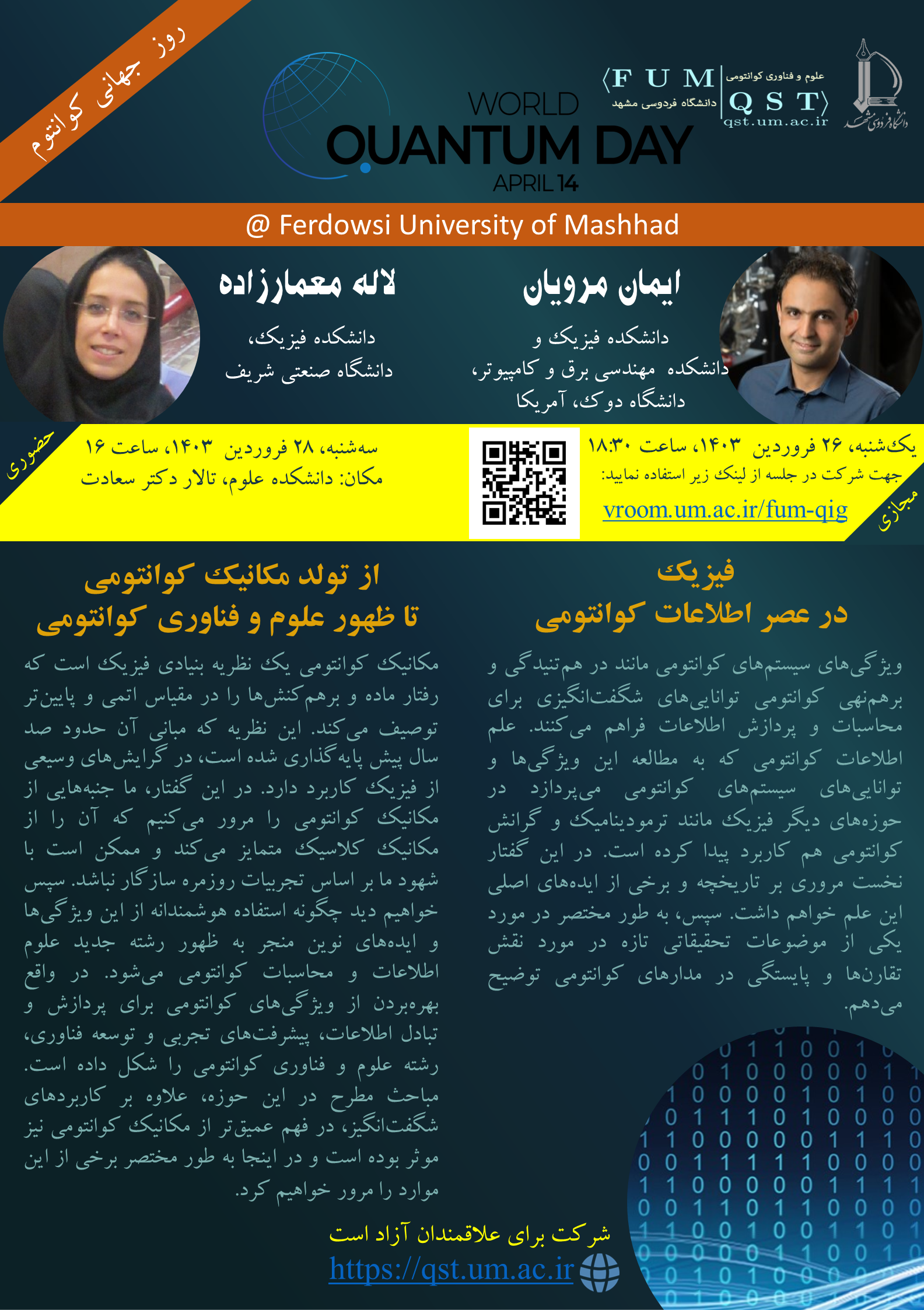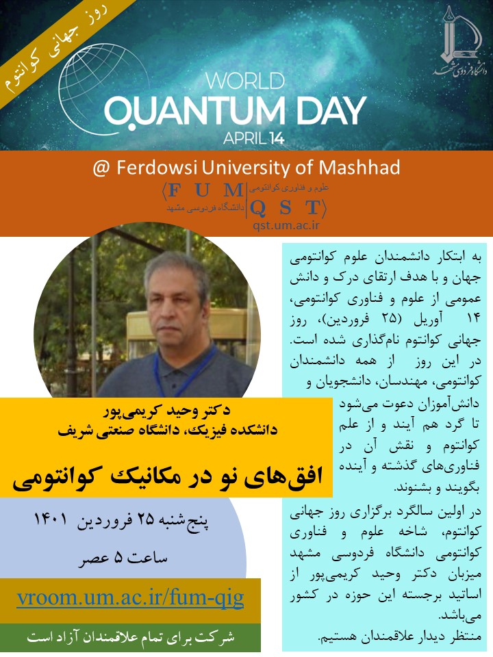 World Quantum Day 2022 @ Ferdowsi University of Mashhad The first celbration of World Quantum Day was held at Ferdowsi University of Mashhad (Thursday | April 14, 2022 | 17:00 | online) Speaker: Prof Vahid Karimipour, Department of Physics, Sharif University of Technology, Tehran, Iran Title: New horizons of Quantum Mechanics Join us https://vroom.um.ac.ir/fum-qig To see the event video, click here. To downlod the event video, click here. |