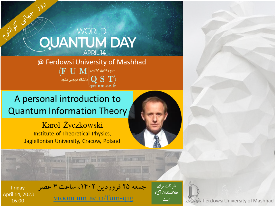 World Quantum Day 2023 @ Ferdowsi University of Mashhad The second celbration of World Quantum Day was held at Ferdowsi University of Mashhad (Friday | April 14, 2023 | 16:00 | online) Speaker: Prof. Karol Życzkowski, Institute of Theoretical Physics, Jagiellonian University, Cracow, Poland Title: A personal introduction to Quantum Information Theory To see the event video, click here. To downlod the event video, click here.